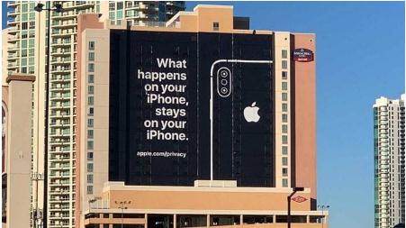在CES現場(chǎng)附近的巨幅廣告上,蘋(píng)果這樣寫(xiě)道:“what happens on your iPhone stays on your iPhone”(iPhone手機收集的信息,都只在手機上)。