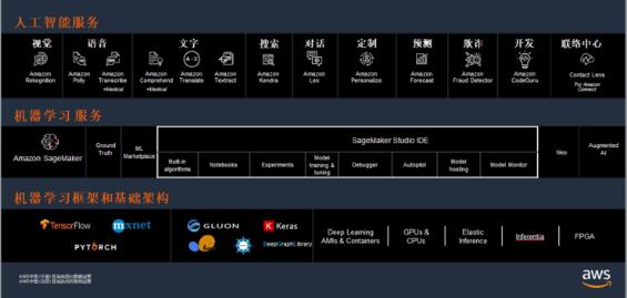 底層是機器學(xué)習框架和基礎架構,AWS 支持 TensorFlow、PyTorch、Apache MXNet、Chainer、Gluon、Horovod 和 Keras 等機器學(xué)習框架。在基礎架構方面,AWS 虛機提供各種各樣的實(shí)例,同時(shí)提供現成的亞馬遜機器鏡像 AMI(Amazon Machine Image)。