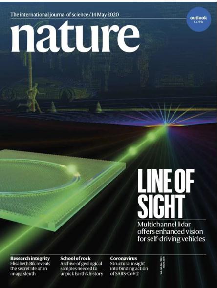 這種超低損耗氮化硅波導,也使得集成微腔光頻梳能夠應用在一些新興的領(lǐng)域。最新一期的《Nature》雜志就以封面形式重點(diǎn)報道了該課題組基于氮化硅技術(shù)的激光雷達工作“Massively parallel coherent laser ranging using soliton microcombs”。劉駿秋制備的氮化硅芯片,在此項工作里起到了關(guān)鍵作用。