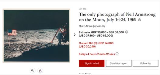 此外,作為第二個(gè)登陸月球的人,奧爾德林的一張照也將在此次拍賣(mài),拍賣(mài)預售估價(jià)在 5040 美元(約合人民幣 3.3 萬(wàn)元)到 7560 美元(約合人民幣 5 萬(wàn)元)。