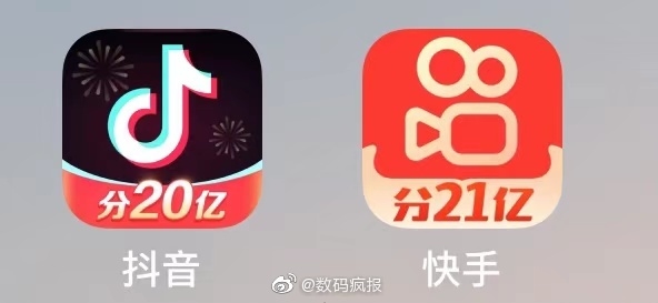 如圖所示,抖音安卓和 iOS 版已經(jīng)同時(shí)更新到分 20 億的新圖標,而快手的“分 21 億”不得不讓人體會(huì )到針?shù)h相對。