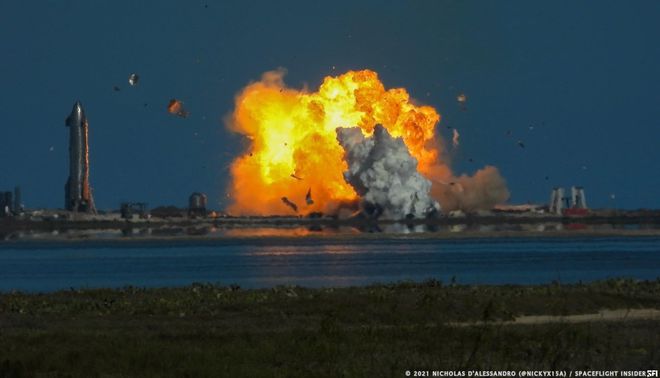 當 SN9 接近地面時(shí),至少有一臺發(fā)動(dòng)機重新啟動(dòng),火箭試圖按照程序調整自己的姿態(tài),在距離發(fā)射臺數百米的地方以尾部先著(zhù)陸。但其似乎未能即使進(jìn)行垂直翻轉動(dòng)作,也不清楚是否有第二臺發(fā)動(dòng)機試圖點(diǎn)火。最終,這枚原型在起飛約六分半鐘后撞向地面發(fā)生爆炸。