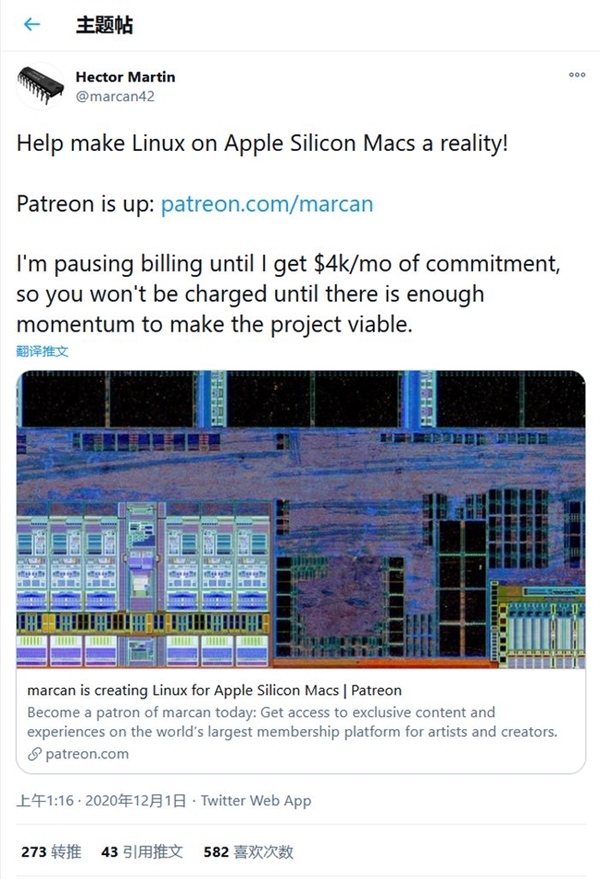 據悉,除了內核工作,還有 "m1n1 "的工作正在進(jìn)行中,作為一個(gè)新的引導加載器來(lái)處理蘋(píng)果的 peculair 引導協(xié)議和 DeviceTree 格式。在內核郵件列表中可以找到 Hector 為讓蘋(píng)果 M1 啟動(dòng)而打出的初步 18 個(gè)補丁。