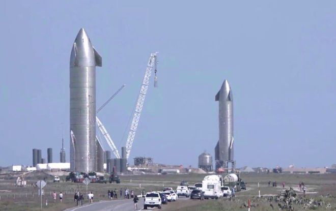 圖示:2021 年 1 月 29 日,發(fā)射臺上的星際飛船原型 SN10(左),SN9 就位于不遠處的另一個(gè)發(fā)射臺