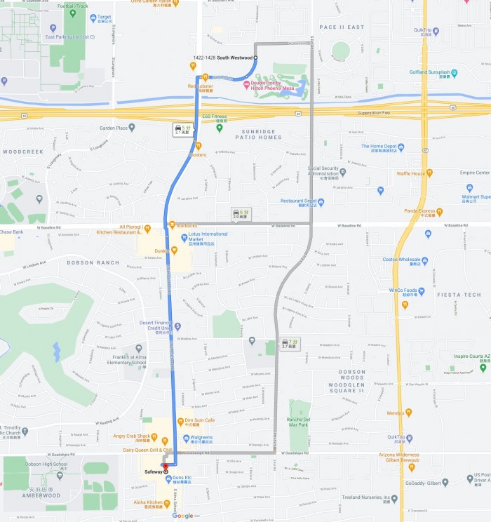 時(shí)間上有差別的原因是因為兩者選擇了不同路線(xiàn),Waymo One 并未依照一般 google 地圖所提供的最短導航路線(xiàn)來(lái)走而是選擇繞路走比較長(cháng)的距離。有一種說(shuō)法是 Waymo 采用的是比較安全的走法,也就是盡量不左轉而是多采用右轉,雖然會(huì )繞一點(diǎn)路但是右轉通常來(lái)說(shuō)比起左轉要安全很多,底下這張圖是 Waymo One 所選擇的路線(xiàn):
