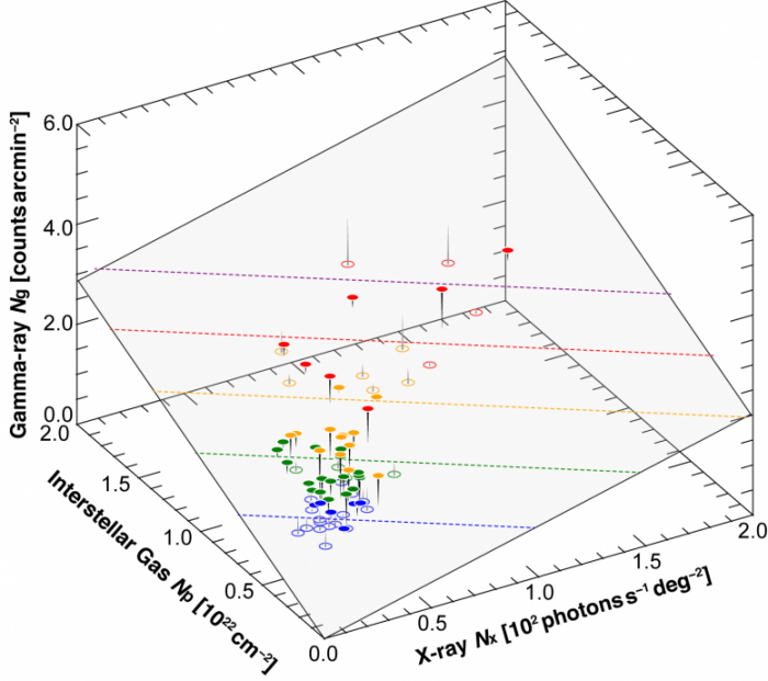 這項研究的原創(chuàng )性在于,伽馬射線(xiàn)輻射是由質(zhì)子和電子成分的線(xiàn)性組合來(lái)表示的。天文學(xué)家知道一個(gè)關(guān)系,即質(zhì)子的伽馬射線(xiàn)強度與通過(guò)無(wú)線(xiàn)電線(xiàn)成像觀(guān)測得到的星際氣體密度成正比。另一方面,來(lái)自電子的伽馬射線(xiàn)也被認為與來(lái)自電子的X射線(xiàn)強度成正比。因此,他們把總的伽馬射線(xiàn)強度表示為兩個(gè)伽馬射線(xiàn)成分的總和,一個(gè)來(lái)自質(zhì)子源,另一個(gè)來(lái)自電子源。這導致了對三個(gè)獨立觀(guān)測點(diǎn)的統一理解(圖2)。