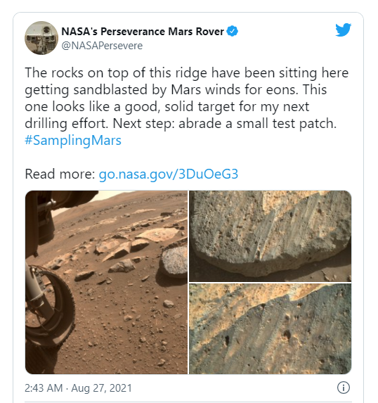 “毅力”號正在檢查一個(gè)名為“CitaDELLe ”的峭壁山脊。NASA 在周四的一份聲明中說(shuō):“山脊上有一層巖石,似乎可以抵御風(fēng)的侵蝕,這表明它更有可能在鉆探過(guò)程中堅持下去。”NASA 在 Twitter 上發(fā)布了該地區和潛在巖石目標的一些觀(guān)點(diǎn)。