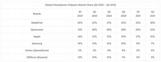 報告顯示 2021 年第 2 季度,蘋(píng)果在智能手機芯片組類(lèi)別中擁有 15% 的市場(chǎng)份額。與去年同期 13% 的份額相比,蘋(píng)果的市場(chǎng)份額實(shí)際上略有增加。而同期三星的市場(chǎng)份額只有 7%。