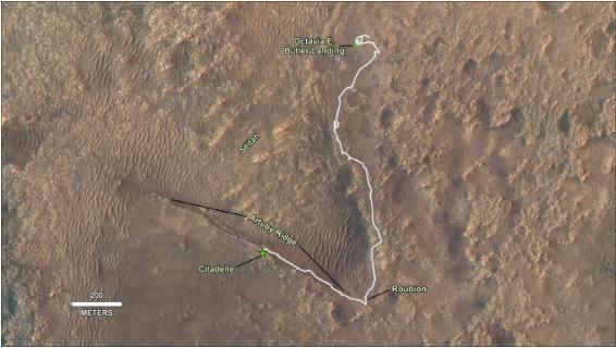 當毅力號在 Citadelle 進(jìn)行采樣活動(dòng)時(shí),Ingenuity 在離地表約 10 米的高度對漫游車(chē)的下一個(gè)潛在采樣地點(diǎn)進(jìn)行飛行勘測。利用第 12 次飛行中 Ingenuity 返回地球"RTE"相機圖像,操作團隊能夠確認進(jìn)入該地區路線(xiàn)的可穿行性。2021 年 9 月 12 日(第 200 個(gè)太陽(yáng)日),毅力號在一天中行駛了 175.15 米,在行駛時(shí)間允許范圍內,在 8 米長(cháng)的路段建立初始地形圖后,其余 167 米的行駛使用了自動(dòng)導航系統,這是毅力號在單日內自主行駛的最遠距離。