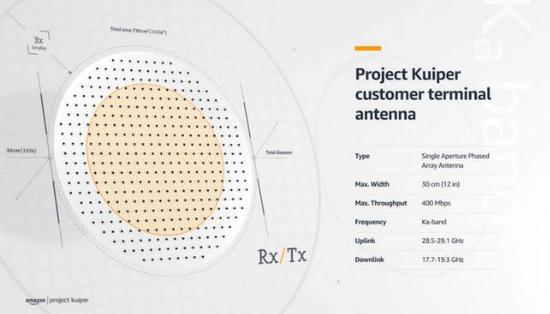 柯伊伯系統公司將使用“低成本客戶(hù)終端”向消費者提供服務(wù)。這個(gè)衛星天線(xiàn)直徑 12 英寸,網(wǎng)速高達 400Mbps。而且亞馬遜還表示:“在未來(lái)的迭代中,性能和速度將繼續提高。”