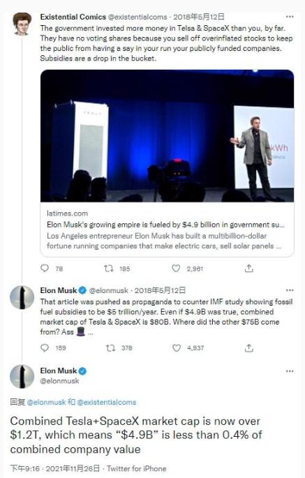 后面的評論是針對有人指責馬斯克不允許將政府投資歸入股份,所以政府不能擁有他的公司的一部分。