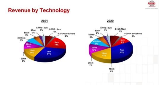 隨著(zhù)臺積電 5nm 技術(shù)的成熟,用戶(hù)對于 5nm 制程產(chǎn)品的接受度逐漸提高。2021 年 5nm 的貢獻占總體晶圓的 19%,相較去年提升了超過(guò)兩倍,已經(jīng)成為了臺積電第二大營(yíng)收來(lái)源,并逐漸接近第一的 7nm,其占比為 31%。