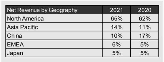 而來(lái)自亞太地區,中國、EMEA(歐洲、中東和非洲)和日本的收入分別占總凈收入的 14%、10%、6% 和5%。其中來(lái)自中國的營(yíng)收比持續下降,這也能從側面看出蘋(píng)果等北美公司吃掉了過(guò)去華為的部分訂單需求從而帶來(lái)的影響。