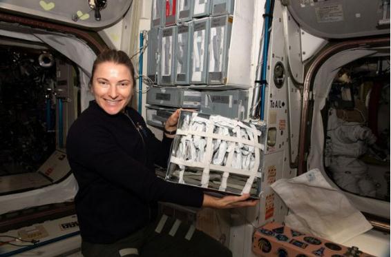 美國宇航局宇航員凱拉-巴倫在空間站的統一艙上展示食物包并準備午餐。