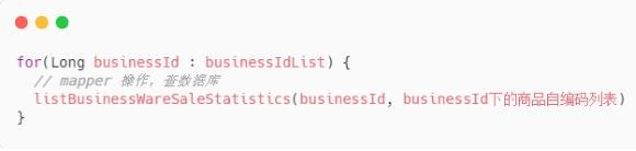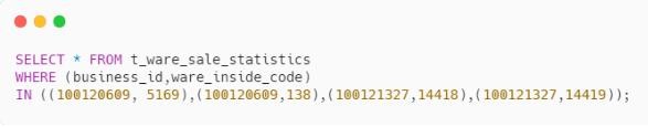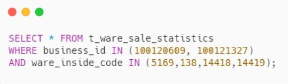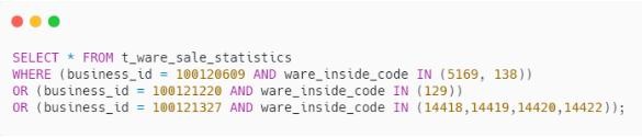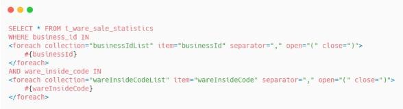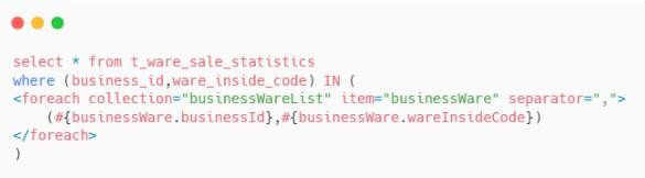 同樣是利用 Mybatis 的 動(dòng)態(tài) SQL ,將 business_id 列表拼在一起、 ware_inside_code 拼在一起,類(lèi)似如下